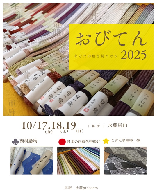 日時:10/17(金)〜19(日) 場所:永藤店内 内容:半幅帯・なごや帯を中心に、遊べる帯が大集合!西村織物さんの新作や、柄を選べるカスタム半幅帯も再登場です。