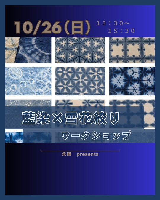 内容:毎年恒例の「雪花絞り」を、今年は藍染めで開催!初心者さんも大歓迎♪ お申し込み受付中です✨